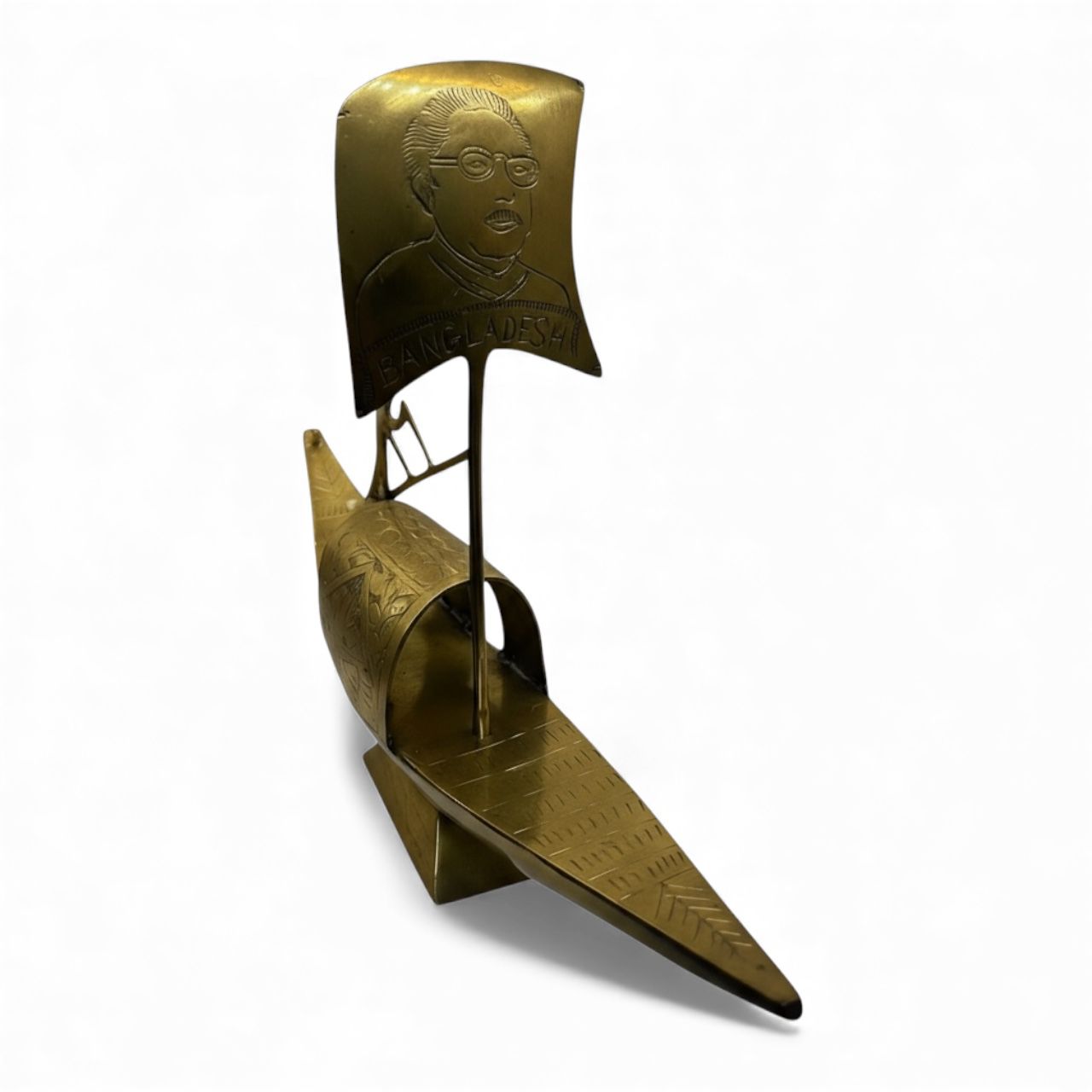 Celebrate Bangladesh’s rich heritage with this historical boat crafted from premium brass, featuring an engraved portrait of the Father of the Nation. Measuring 18×12 inches and weighing 4 lb 4 oz, it’s a substantial and elegant display piece for home, office, or exhibition spaces. Durable, intricately detailed, and culturally significant, this brass masterpiece makes a remarkable gift or collector’s item.