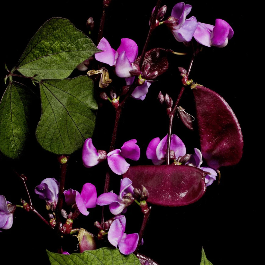 Purple Moonshadow Hyacinth Bean Seeds (Lablab purpureus) produce breathtaking purple flowers followed by deep purple pods on fast-growing climbing vines. This ornamental heirloom vine is highly valued for its beauty, vigorous growth, and pollinator attraction.